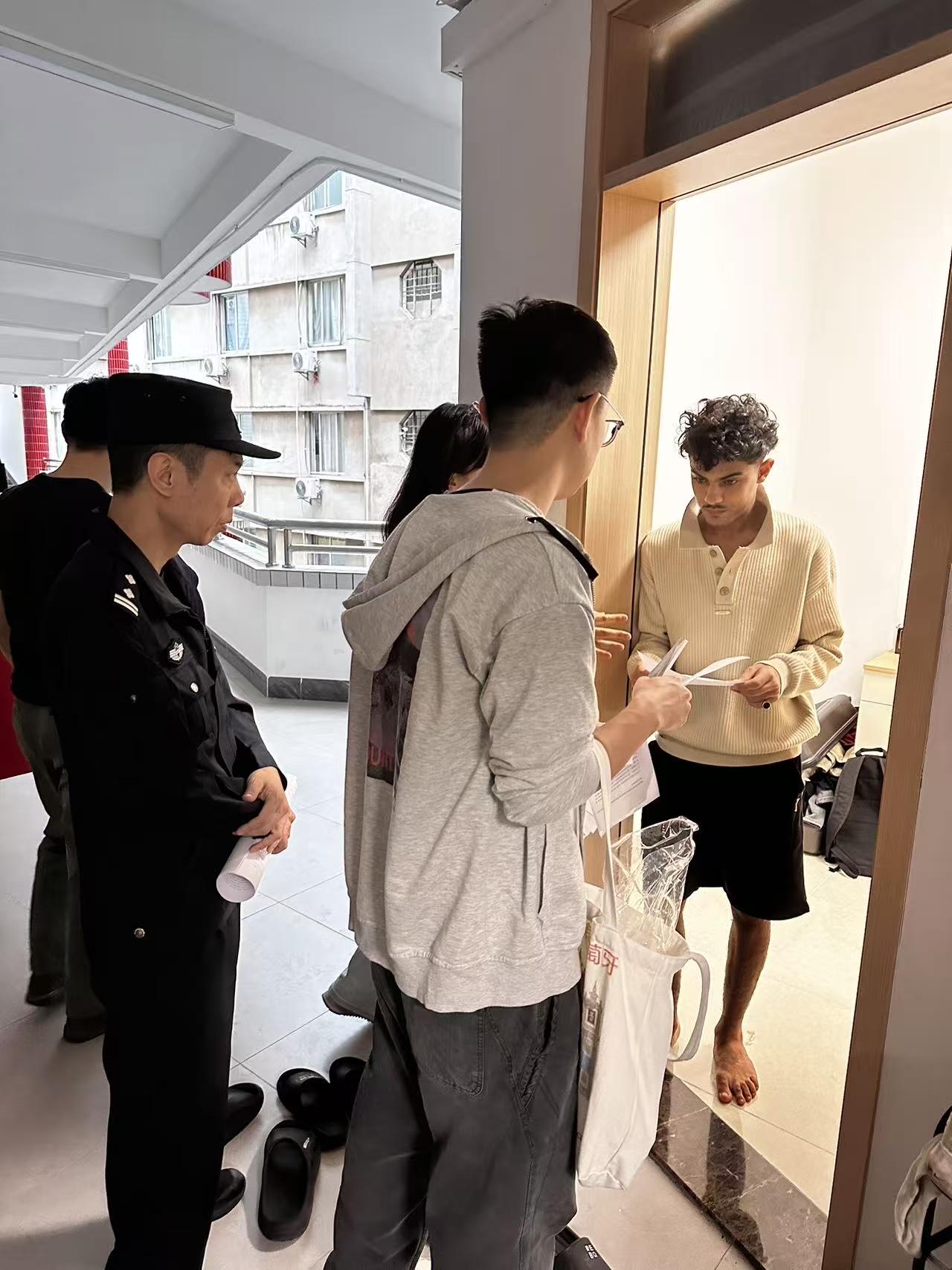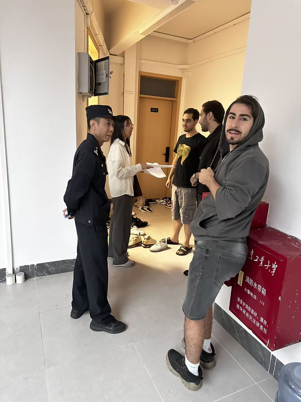 11月12日下午,学院联合学校保卫处、黄花岗街道派出所等走访北院国际学生公寓,就校内住宿管理、电动车使用、环境卫生、安全防范、违纪处分等与国际学生进行面对面交流和提醒教育。学院工作人员现场向国际学生发放了新汇编的国际学生手册及来华留学重要须知等。